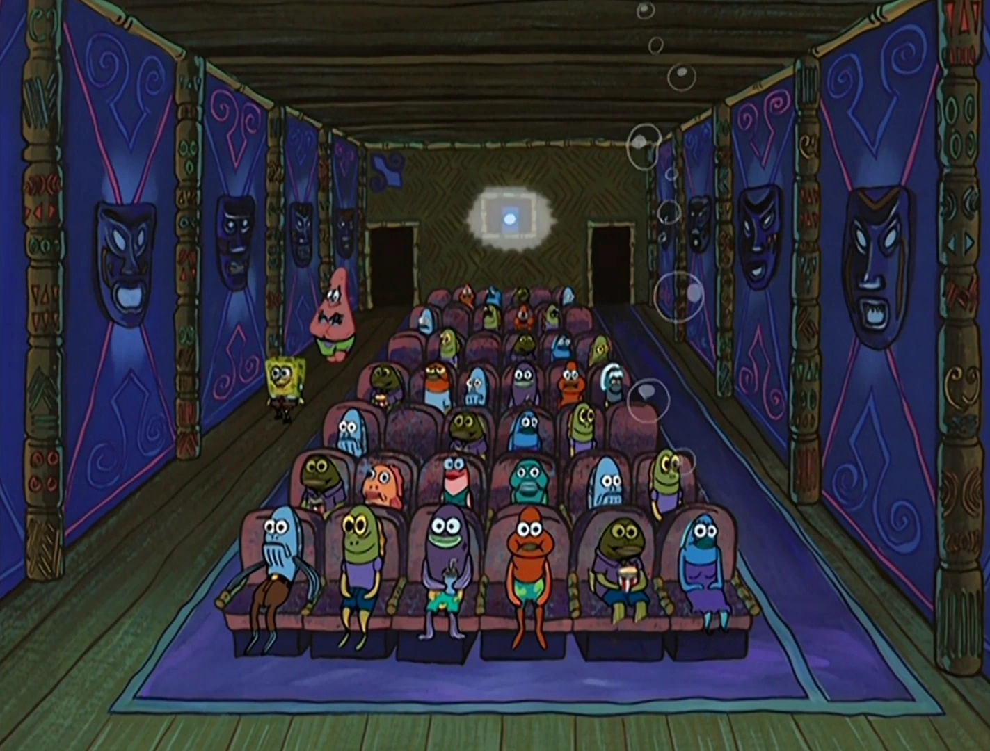 - Después de que Patricio grita "¡Quiero que todos lo vean!", Aparentemente "todos" abandonan el teatro, dejándolo completamente vacío. Sin embargo, más tarde, cuando Patricio va al baño, la gente todavía está allí. Es posible que tengan la suerte de no oler el mal aliento.