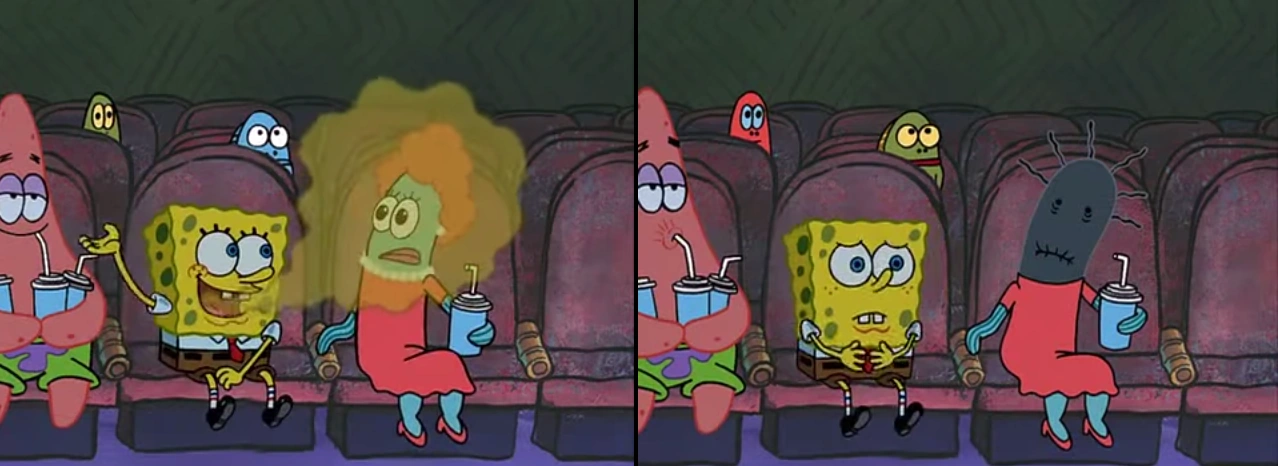 - Bob Esponja y Patricio se sientan primero en la primera fila. Pero más tarde, cuando Patrick levanta a Bob Esponja, parecen estar en la fila del medio.