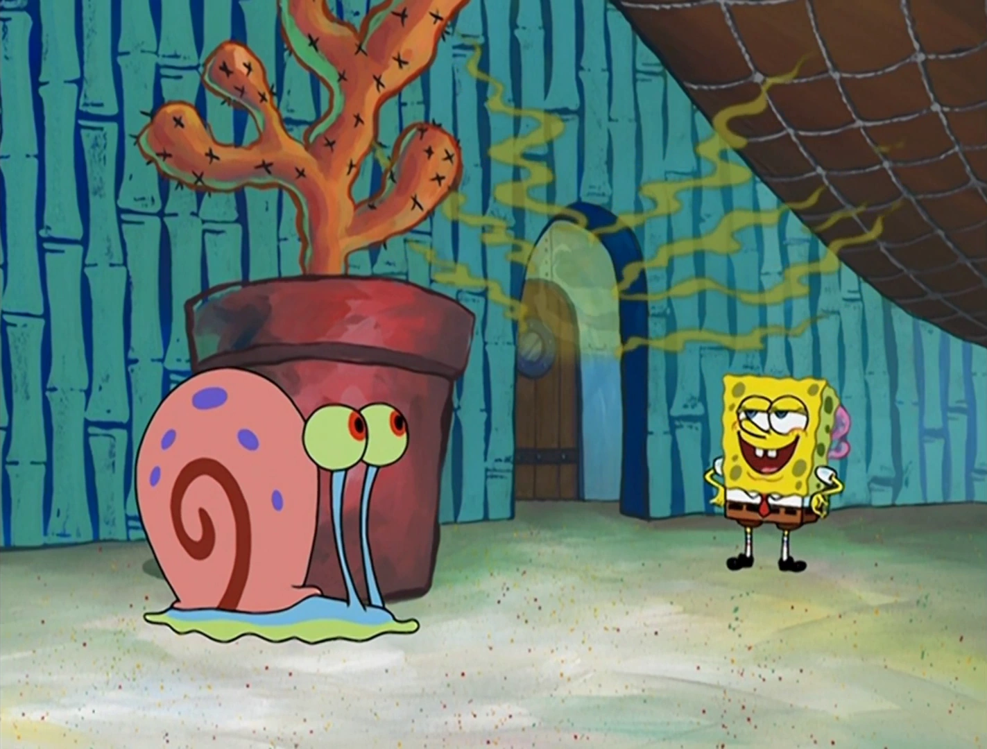 - Cuando Patricio dice "No te preocupes por él, Bob Esponja," el pez vuelve a ponerse verde.