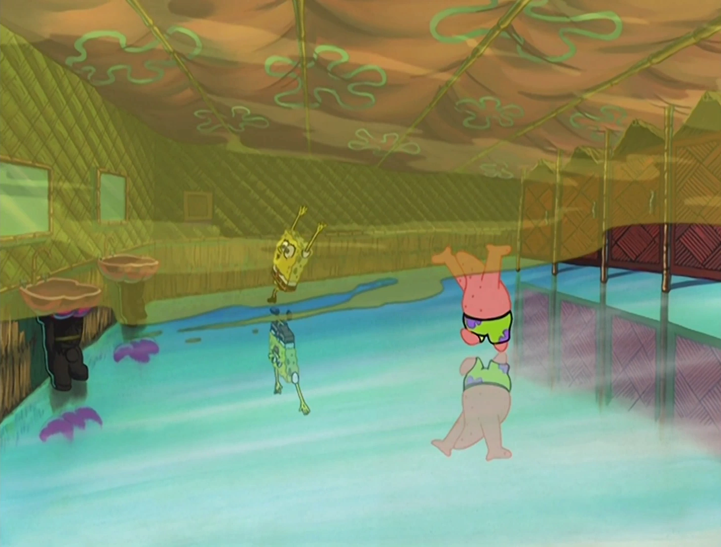 - En el baño, cuando Bob Esponja abre por primera vez la puerta del cubículo, el reflejo de Patrick no se mueve.