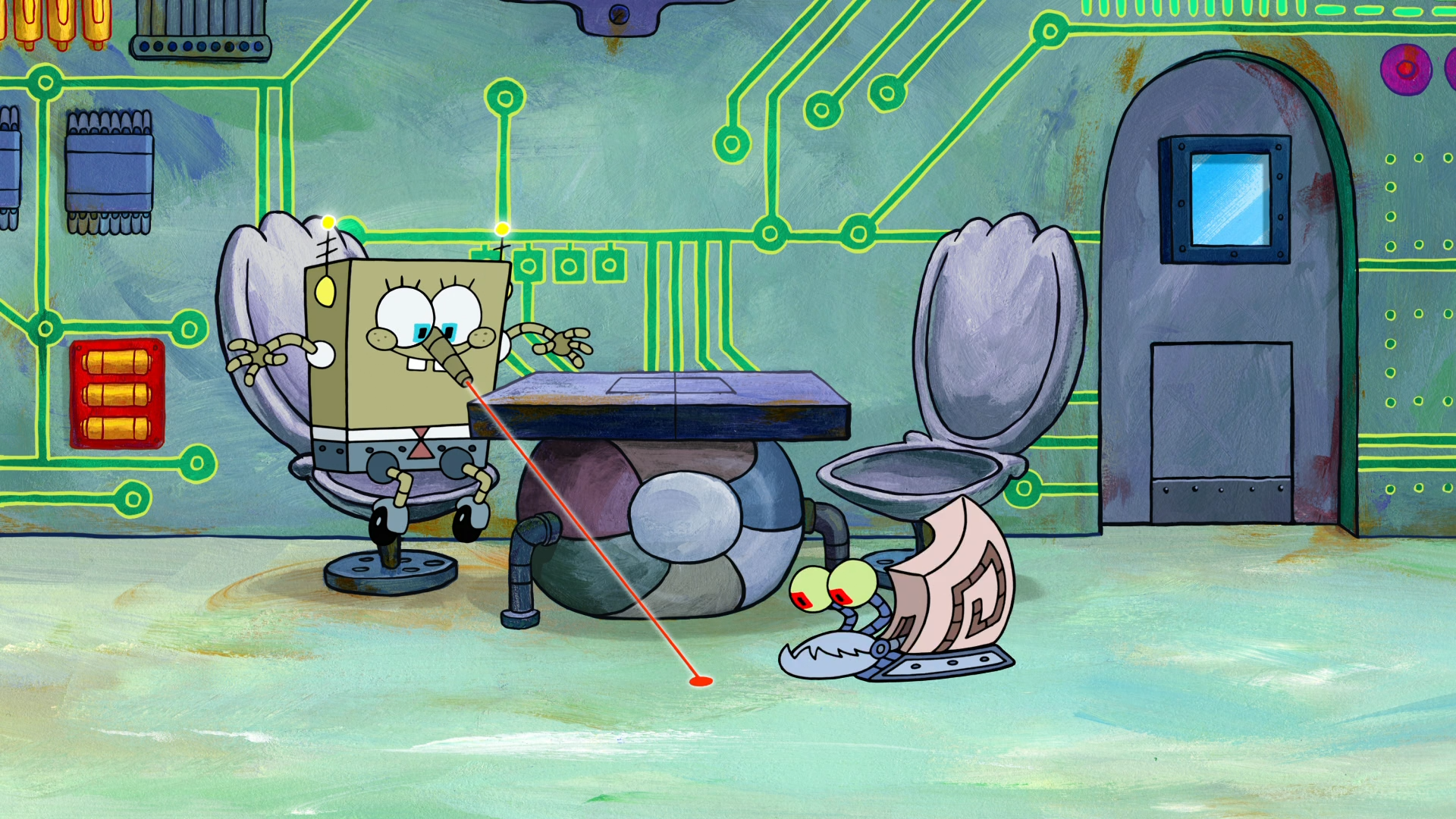 SpongeBot arrives late to work, where SquidBot is waiting. SpongeBot uses a key in his finger to open The Krabby Battery, pressing a button that makes a giant hand drop a large battery into a receptacle. This forms the basis of the restaurant. Inside, Mr. Krabs is a robot on a track, who is malfunctioning and repeatedly saying, "You're fired!" SpongeBot hits him with a large wrench to fix him. SquidBot comments that he wishes he was fired, much to SpongeBot's horror, and RoboKrabs orders them both back to work.