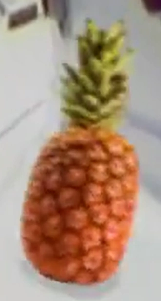 Es una piña gigantesca con ventanas azules, puerta, hojas verdes en la parte superior y chimenea.