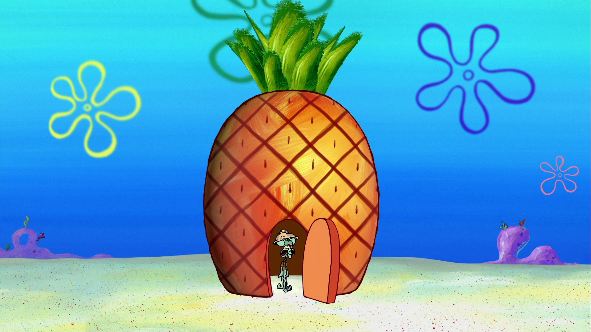 - En el episodio "Atrapados en el Congelador", se muestra que un barco de carga transportaba fruta y una piña se cayó del barco y aterrizó cerca de la casa de Calamardo; de repente aparecen una puerta y ventanas.