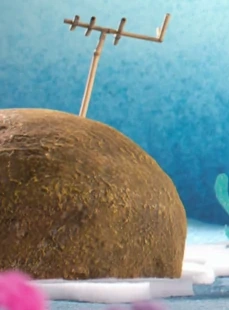 La casa es una gran roca semiesférica de color marrón con una veleta color canela en forma de flecha en la parte superior. Como una puerta, la roca tiene bisagras para abrirse y cerrarse.
