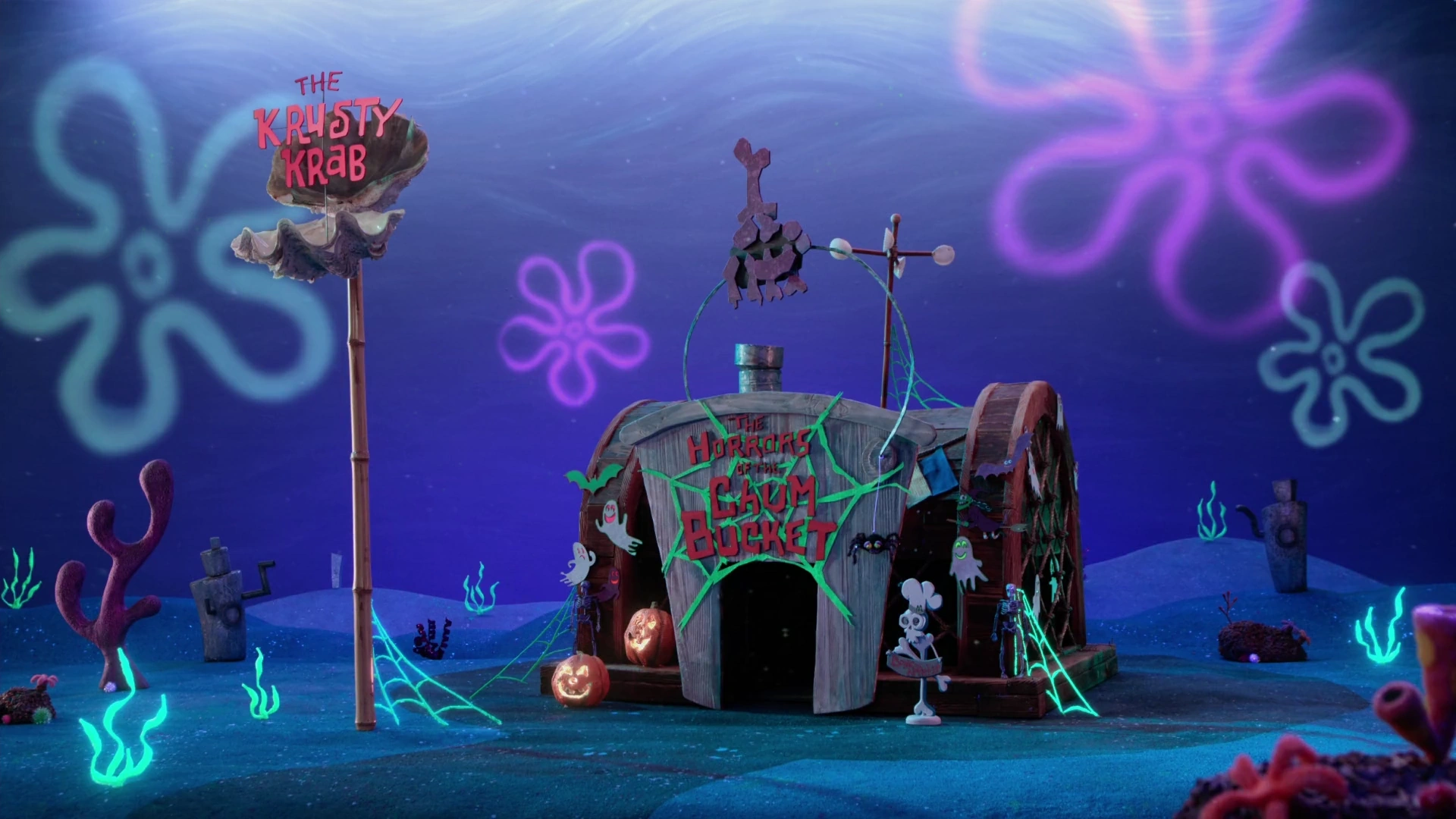 En "Cangre-Zombi-Burger," hay un laboratorio subterráneo donde Arenita Mejillas trabaja con Don Cangrejo para realizar experimentos con la comida y las bebidas.