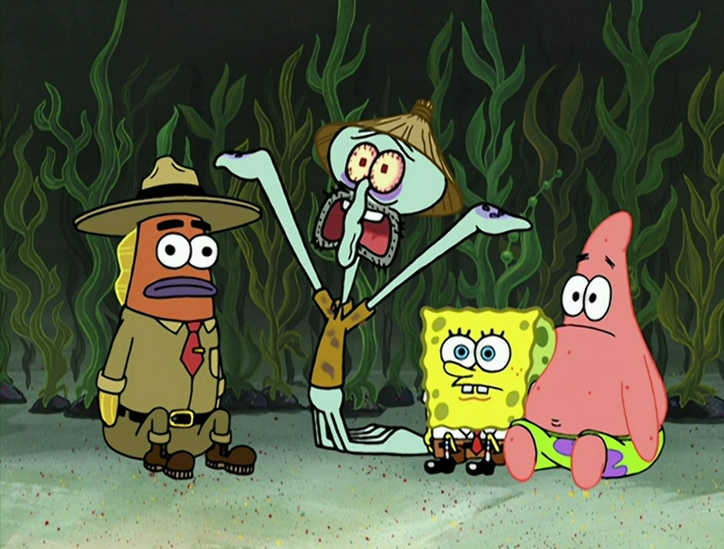 Pasa aún más tiempo y, a estas alturas, Calamardo ha desmantelado la caja para construir un refugio. Tiene un sombrero hecho con alguna planta seca, le ha crecido una sombra de las cinco y está sentado junto a una pequeña fogata. Un pequeño insecto pasa corriendo, y Calamardo lo atrapa y procede a cocinarlo. Se burla de Bob Esponja y Patricio con su "comida," diciendo que podrían haberse puesto del lado de él y sobrevivir, pero en cambio escucharon a un caparazón que hablaba. Él procede a decir mientras se ríe entre dientes: "¡Como si las respuestas a todos tus problemas cayeran del cielo!"