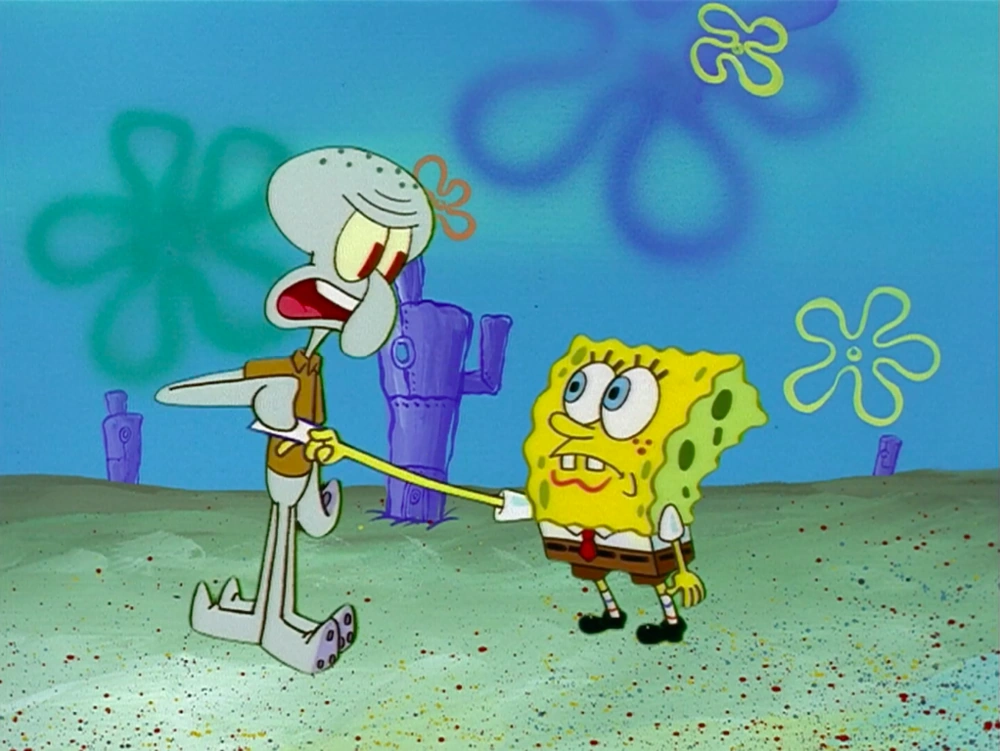 - Cuando Calamardo intenta quitarle el papel a Bob Esponja, el color de la piel de Calamardo es pálido