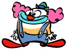 Es un pez disfrazado de payaso con cabello rosa oscuro, labios turquesa claro y guantes blancos. Tiene la piel de color naranja tostado y usa un sombrero de rayas azules de color verde claro, un mono azul oscuro con botones verdes y zapatos de color rojo oscuro y naranja.
