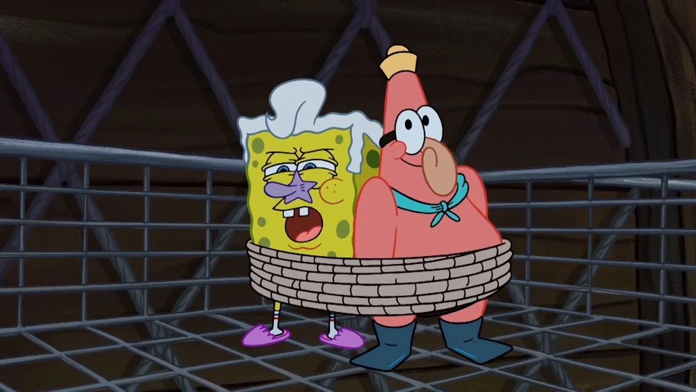 - Mientras Bob Esponja y Patricio están atados a una trampa de grasa, a Patricio le faltan las cejas y también le faltan los puntos.