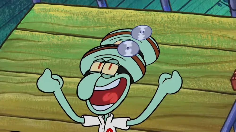 - En unos pocos fotogramas, mientras Calamardo se ríe como un maníaco, su frente se duplica.